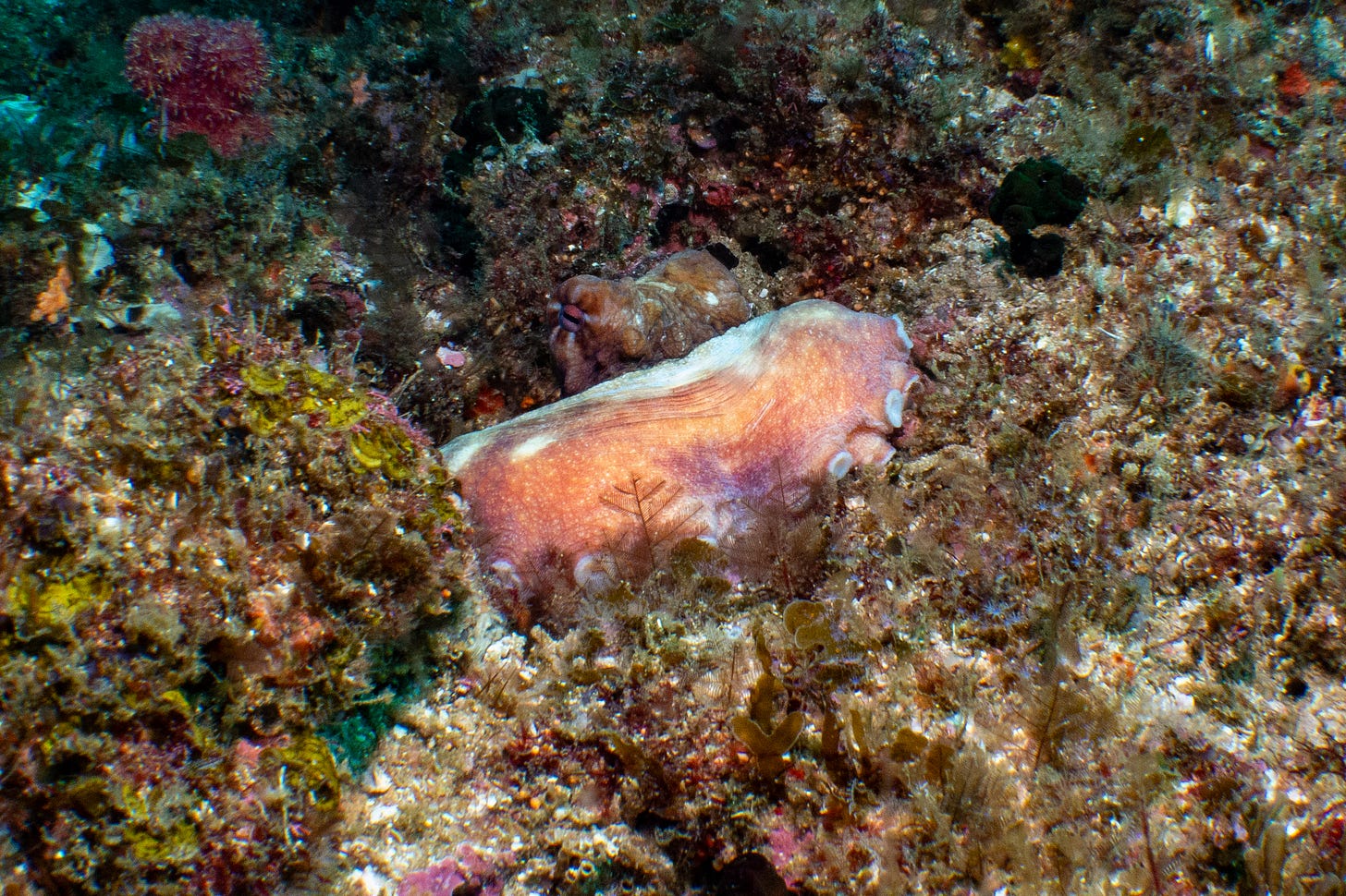 During the start of the dive, somebody said that it was their goal to finally see an octopus on the reef. We hadn’t seen any. Until right before we began to make our ascent, one was spotted, with its tentacle wrapped around itself, sticking out of a hole
