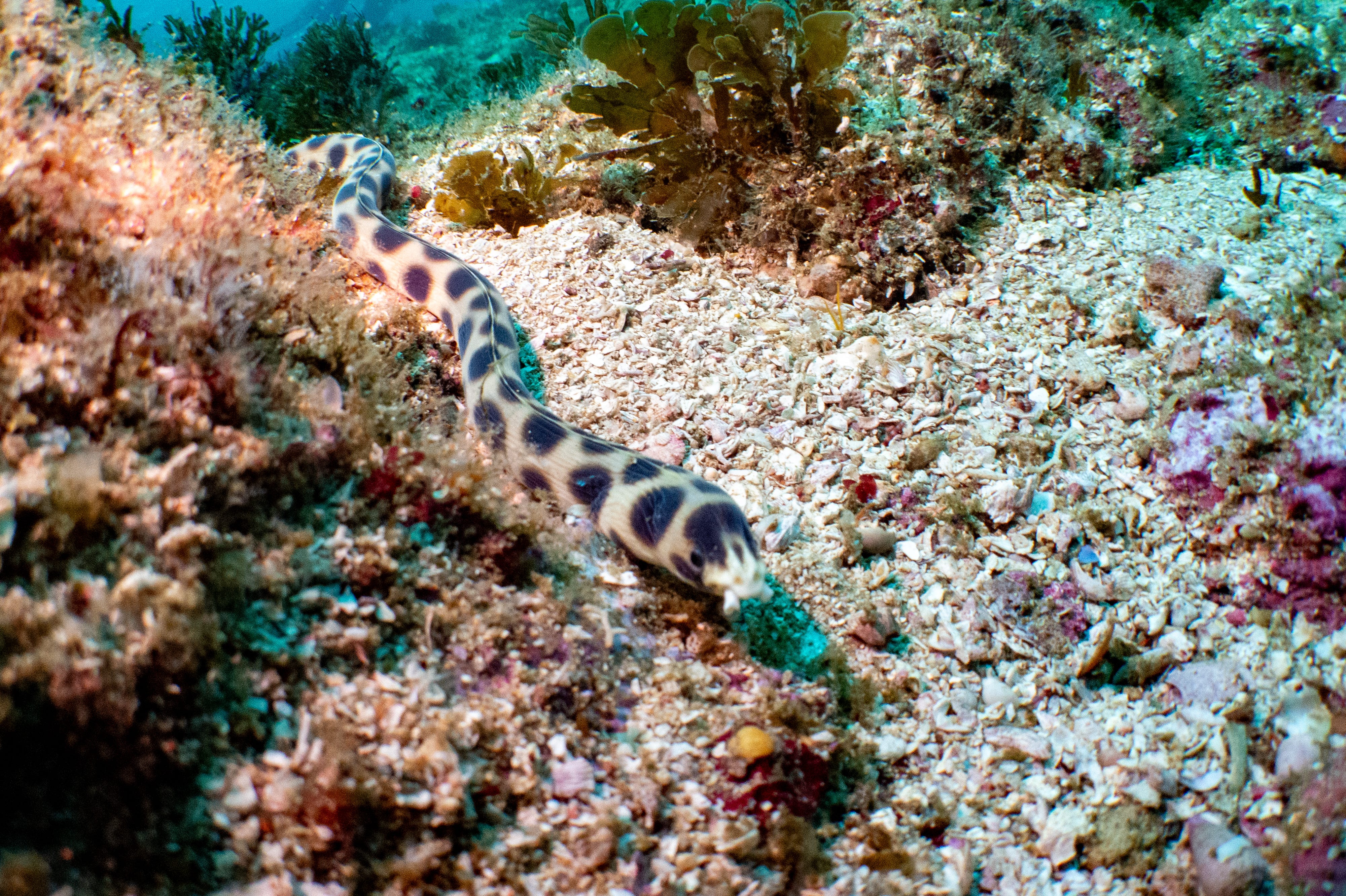 We came across a spotted snake eel (Myrichthys tigrinus) on the dive, an animal I had never seen before! I was very excited to photograph it. By the time it was my turn to get some images of it, the group was mostly gone, so I only had a quick chance to snap some pictures. Unfortunately, my settings were very wrong from my attempts at shooting towards the sun. I got some snapshots, but no wonderful pictures. The snake eel was very cute and curious, and came to inspect my camera before I drifted away.