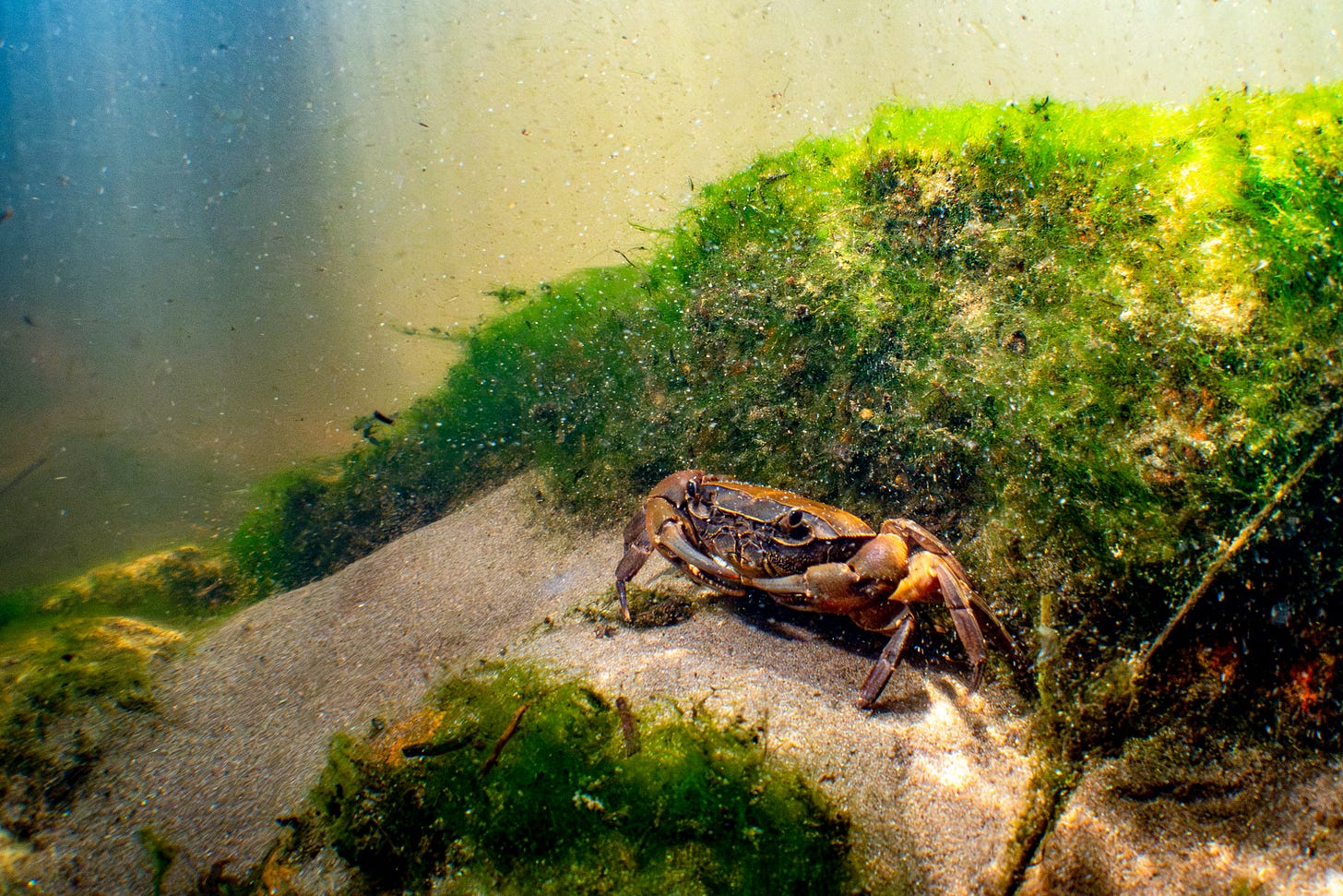 The water when I did my exploring was quite pleasant, as it was summertime. I knew that there were trout, but was hoping to find more native animals, crabs and fish. Which is exactly what I managed to do. Almost as soon as I got into the water, I found crabs! Cape river crabs (Potamonautes perlatus), to be exact. They were quite skittish, and I had my wide lens on, so I needed to sneak very carefully and compose shots that would look good, making the dark crab stand out in a tea coloured river is not the easiest thing, but thankfully, I did have a strobe.