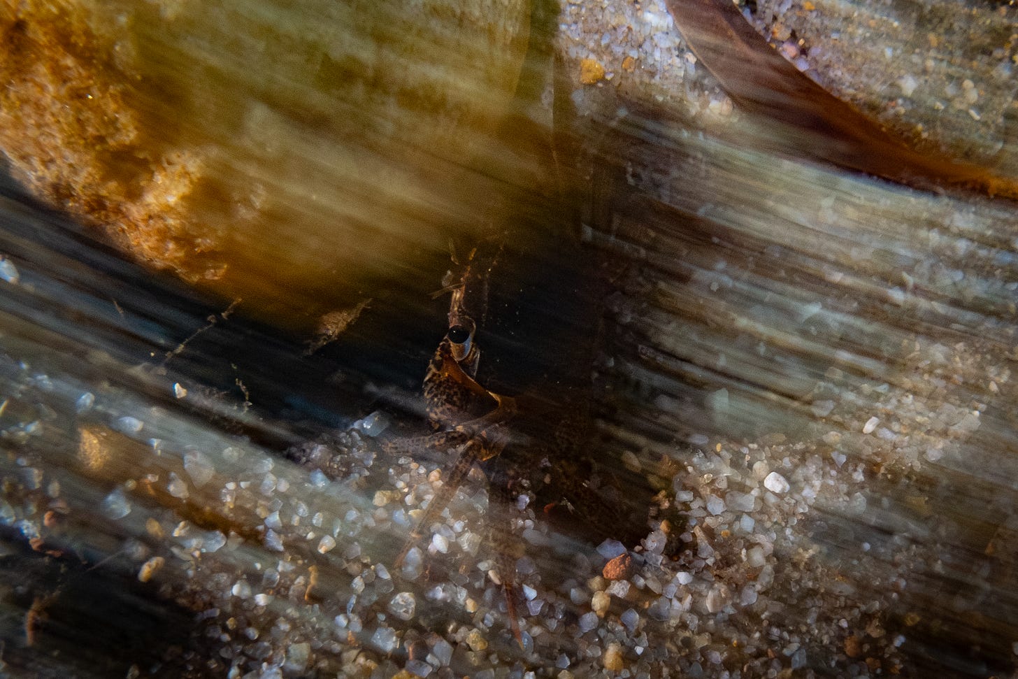 Along with the larvae, I encountered a few crabs, but much smaller than the ones in the calmer sections of the river or pools. I did have the thought to use a slow shutter speed to convey the motion going on this time. I positioned myself directly above a crab hiding among some rocks where some sand and detritus had pooled and set my flash sync to happen on the second curtain. At first, there wasn’t really that much motion as the crab was below where all the aeration was. I incorporated some movement of my own to get the effect of motion happening where the crab was.