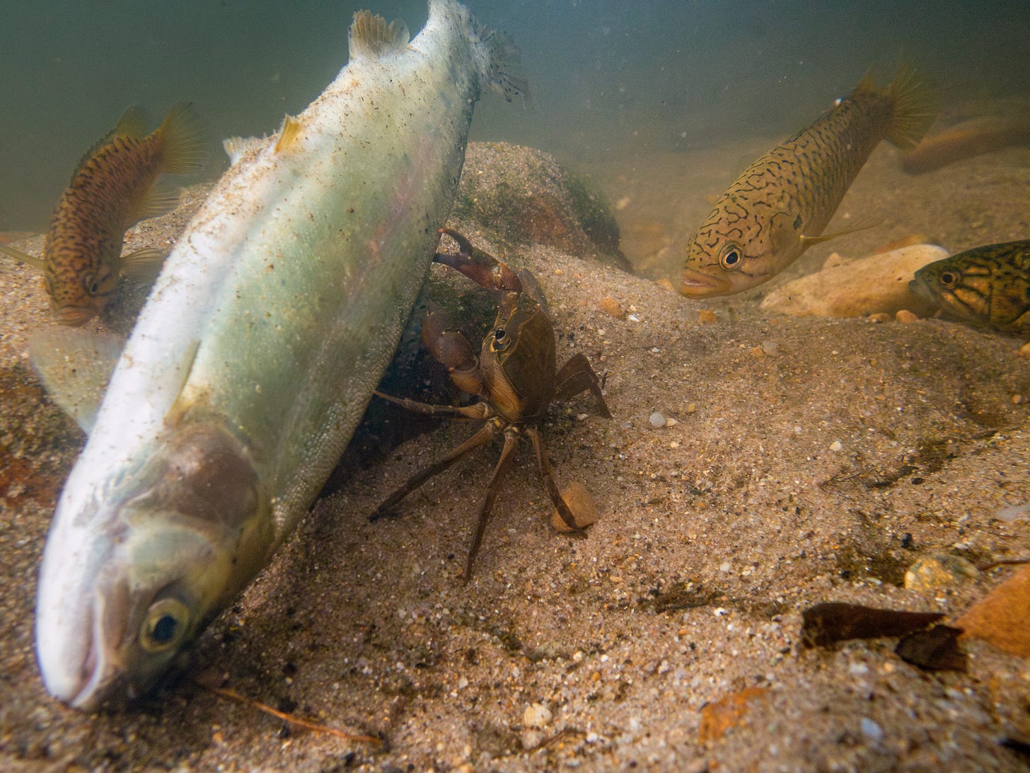 It was cool and all photographing these invertebrates, but what I really wanted was the fish, the initial animals that inspired me to explore the river with my camera. And I was in for an absolute treat. Whilst crawling along the river, I came across a dead trout. Now, on its own, not a great subject for a photo. I wasn’t the only one to find the trout, though. About 7 Cape kurpers (Sandelia capensis) had found it as well, and had already made short work of the fins of the fish, nipping away at the bits of flesh. Whilst photographing the scene in front of me, something I had never expected happened. A cape rock crab burst out from underneath a rock and headed straight for the fish, and started tearing pieces off and eating. The initially startled kurpers became very curious about this intruder and began to inspect. The crab viewed this as a threat and waved a claw at the fish whilst continuing to eat with the other. Eventually, it did get the message and scurried off with both claws raised to dissuade the fish from coming too close.