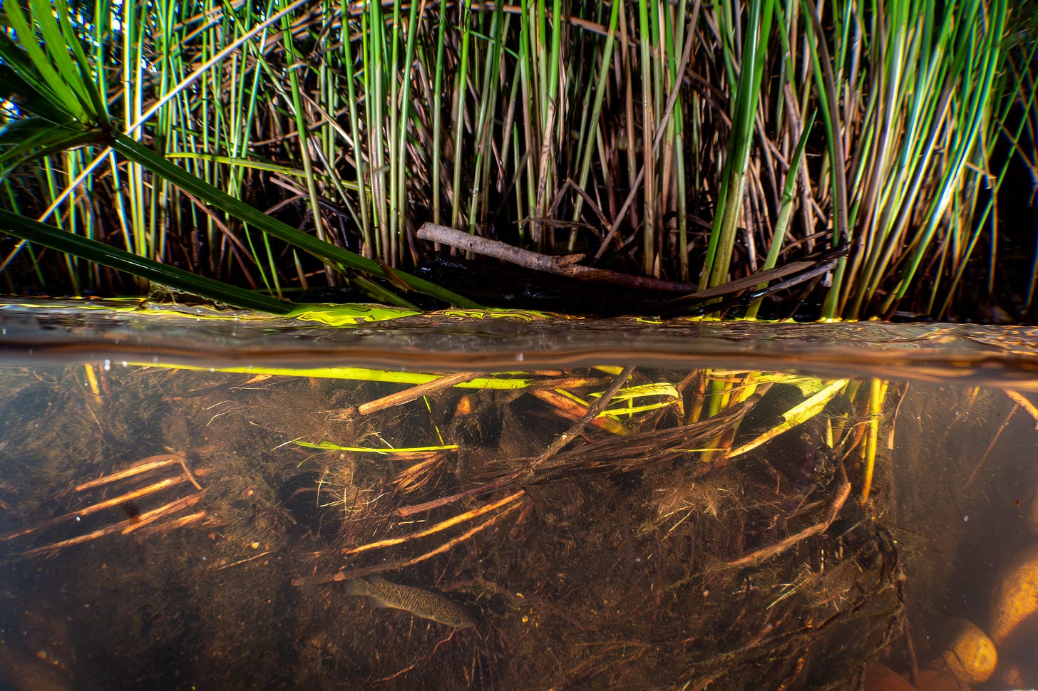 Now that I had some fish images, I decided I wanted to try and get some split shots. Not the easiest thing to do with a water-based optic. For my Dyron wide-angle lens, there needs to be water between the optic and the lens port of the housing, and water on top for optical performance. The water on the front wasn’t too hard to deal with. The draining of the water from between the optic and the port was quite annoying; often, I would get a line in the middle from where the water was draining. Eventually, I was quick enough to get a picture of the underwater reeds and the reeds above. There is quite a bit of diffraction above, but that’s to be expected a bit, the optic is meant for underwater.